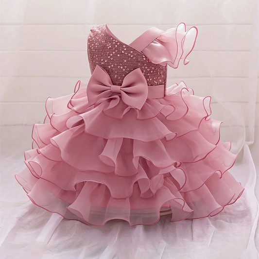 Baby Pink Multi Layered One Shoulder Sequin Frock