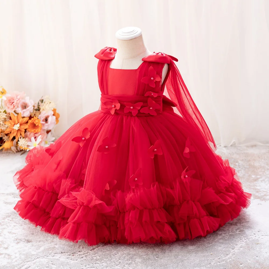 Baby Red Multi Layered Shoulders Bow Pearls Frock