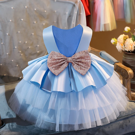 Baby Sky Blue Golden Bow Multi Layered Frock