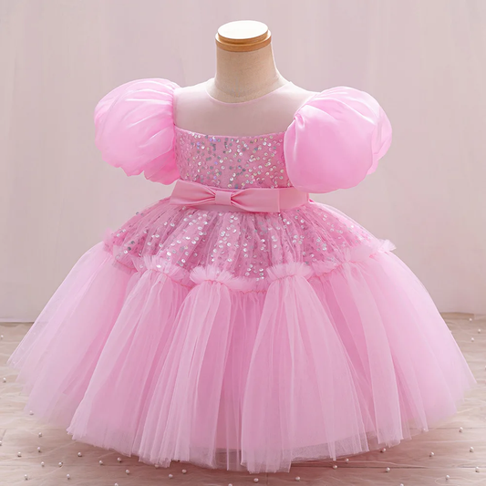 Baby Pink Sequin & Net Bubble Sleeves Frock