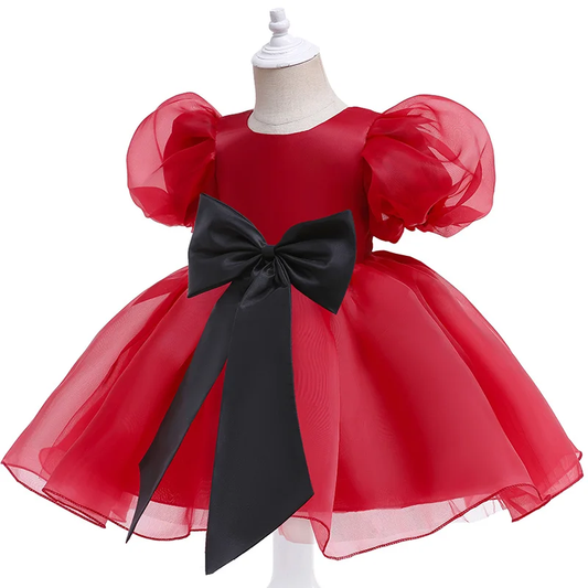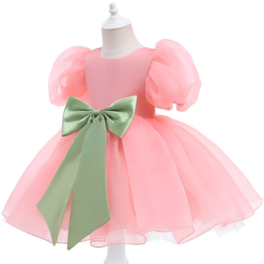 Baby Blue Puff Sleeves Frock With Pink Bow